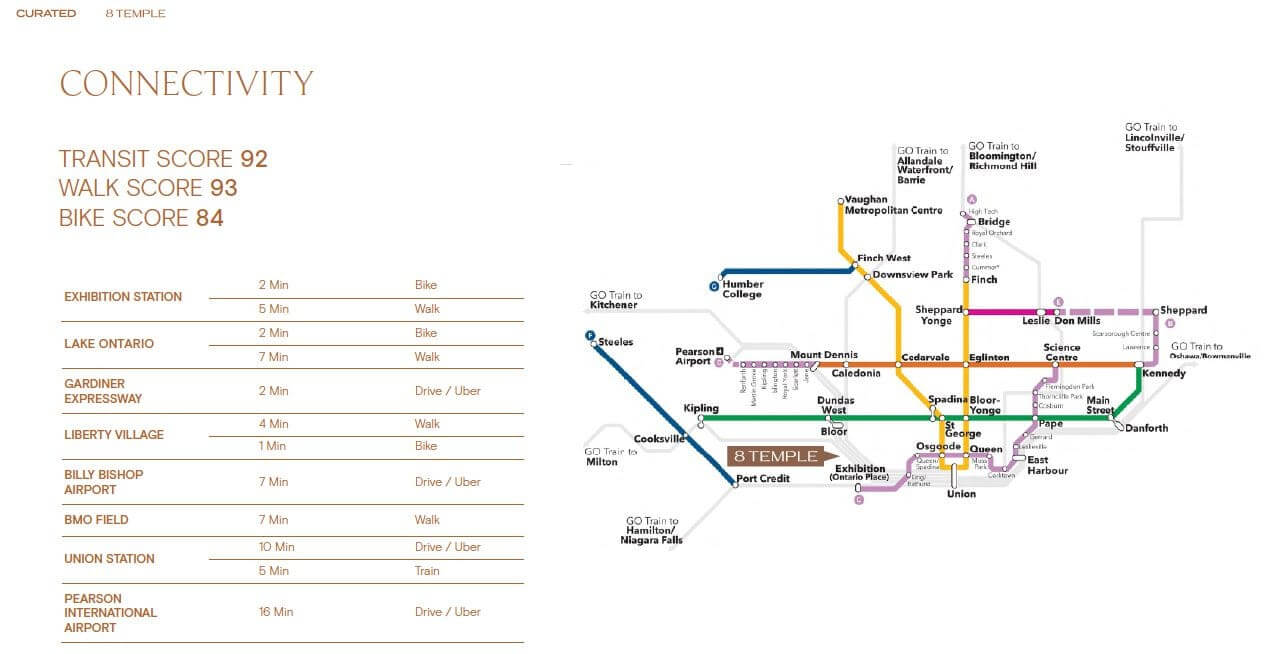 8 Temple Condos is a commuter’s dream. With a near-perfect Walk Score of 93, a Transit Score of 92, and a Bike Score of 84, every option is on the table—whether you walk, ride, take transit, or drive.